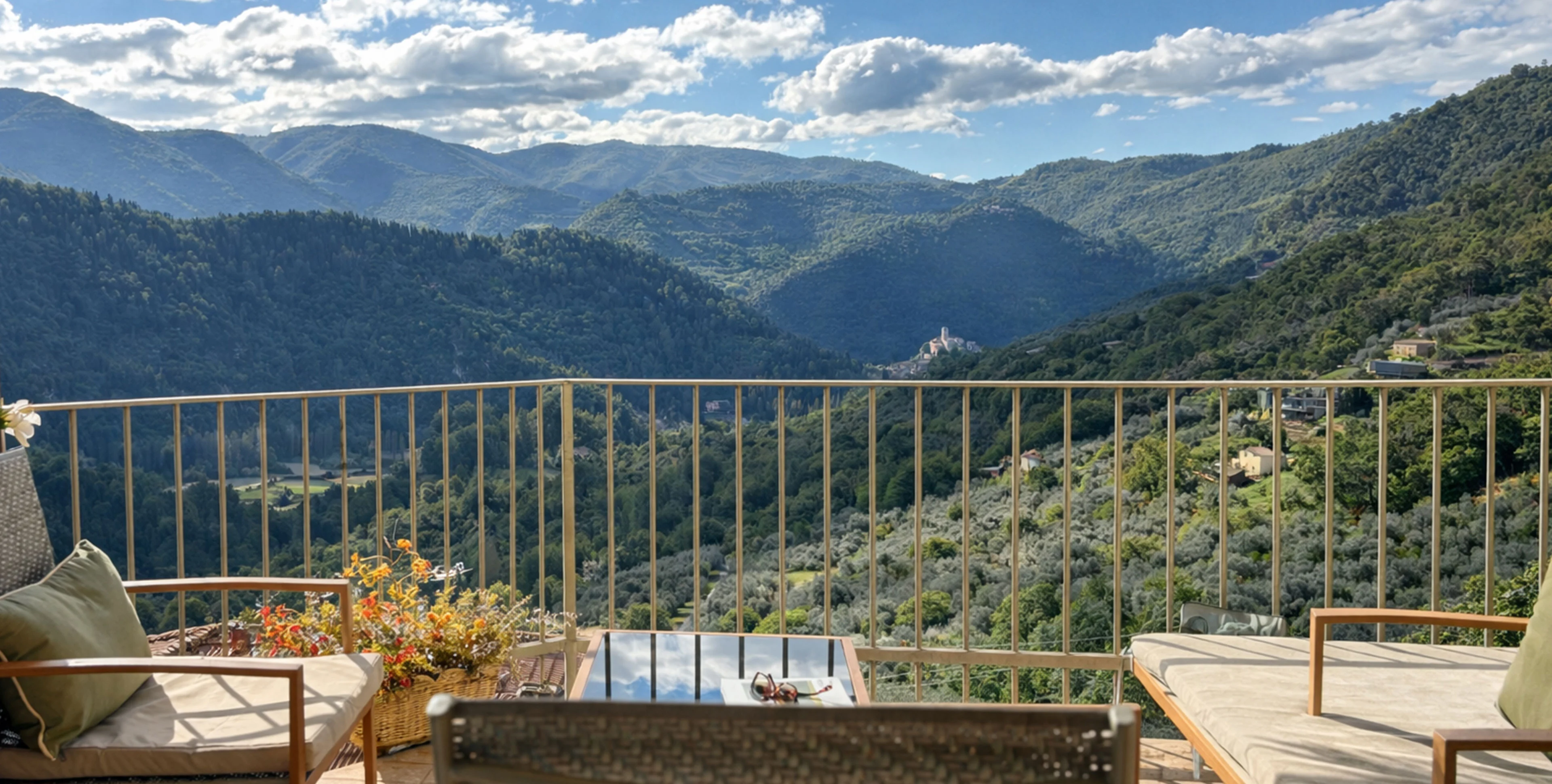 A panoramic terrace with stunning valley views, enhanced by natural plants and a comfortable outdoor sofa—an ideal setting for al fresco breakfasts and evening aperitifs in the heart of Umbria.
